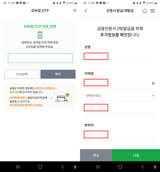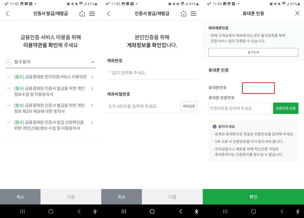 하지만 다른 은행들도 과정 자체는 비슷합니다. 모든 진행은 <인증/보안> 쪽에서 <금융인증서 발급>에서 이루어집니다.