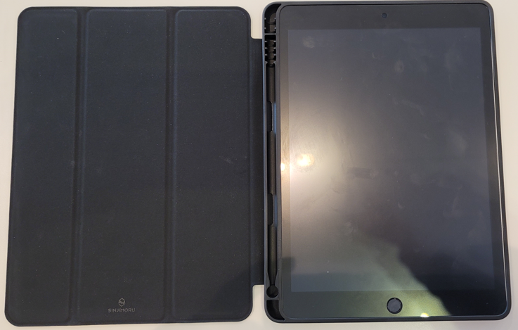 커버를 씌운 다음 촬영한 사진. 앞면은 자석식으로 되어 화면을 딱 보호해 주고, 뒷면은 그냥 커버라서 문제없이 보호된다.