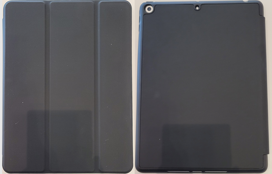 왼쪽이 커버를 펼쳤을 때의 안쪽 커버 모습, 오른쪽은 커버 내에 안전하게 장착된 아이패드 9세대의 모습이다.