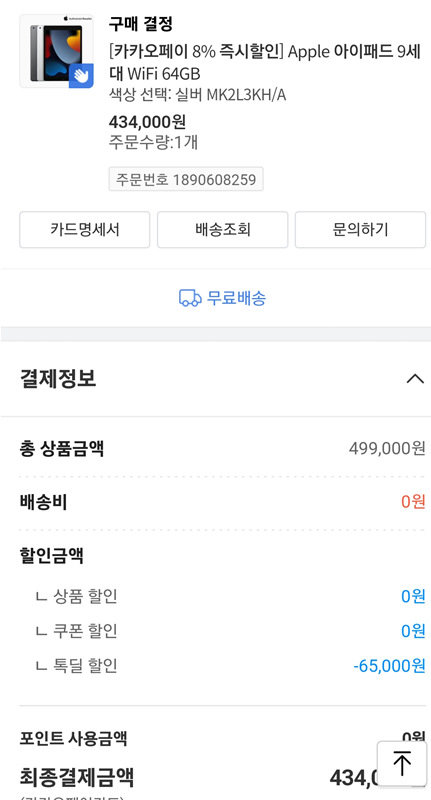톡딜로 65000원 할인해 준 가격 434,000원에 8% 할인받아서 최종 399,280원 지불하여 완료!